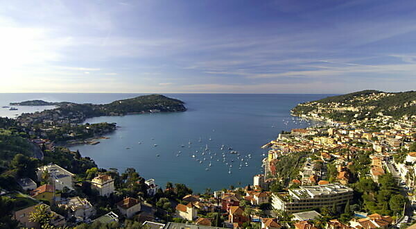 Bildagentur Mauritius Images Sudfrankreich Blick Von Der Moyenne Corniche Nach Villefranche Sur Mer Und Cap Ferrat Sudfrankreich Frankreich Ausblick Kuste Mittelmeer Meer Bucht Riviera Corniche Landschaft Ortschaft Hauser Hafen Bucht
